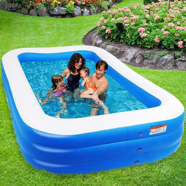 - FULL-SIZED INFLATABLE POOLS – The size of family inflatable swimming pool is big that entire family can fit it in. It can fill 312 gal water capacity and fit a family with 3 adults and 3-4 kids to enjoy a splashing pool party. When not in use it can be deflated and folded quickly and easy to storage.